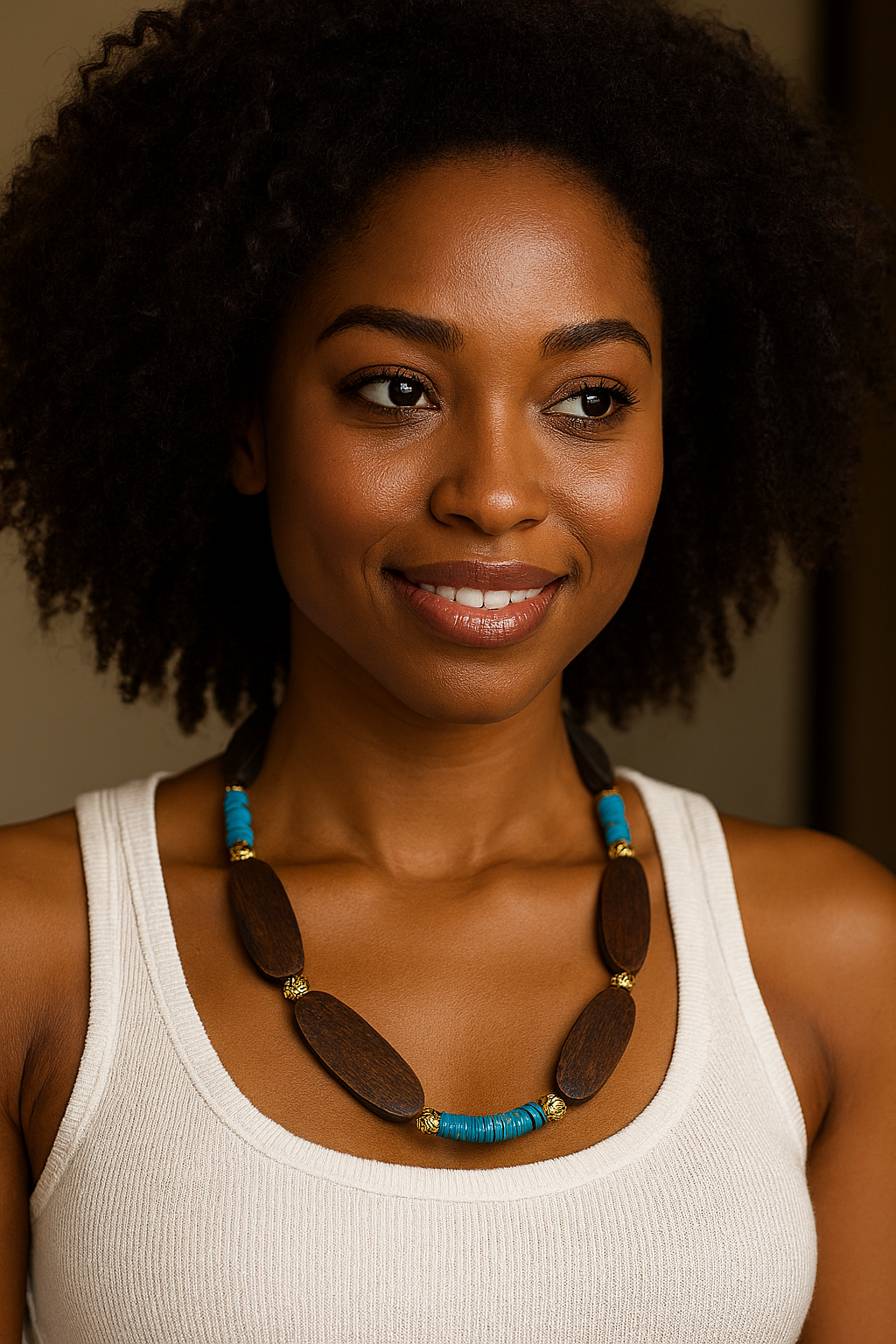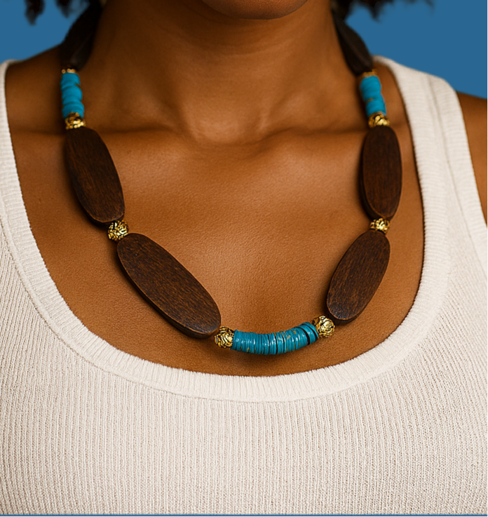 “Doğal taş & ahşap boncuklu kolyemiz, bohem ruhunuza eşlik edecek özel bir tasarımdır.”